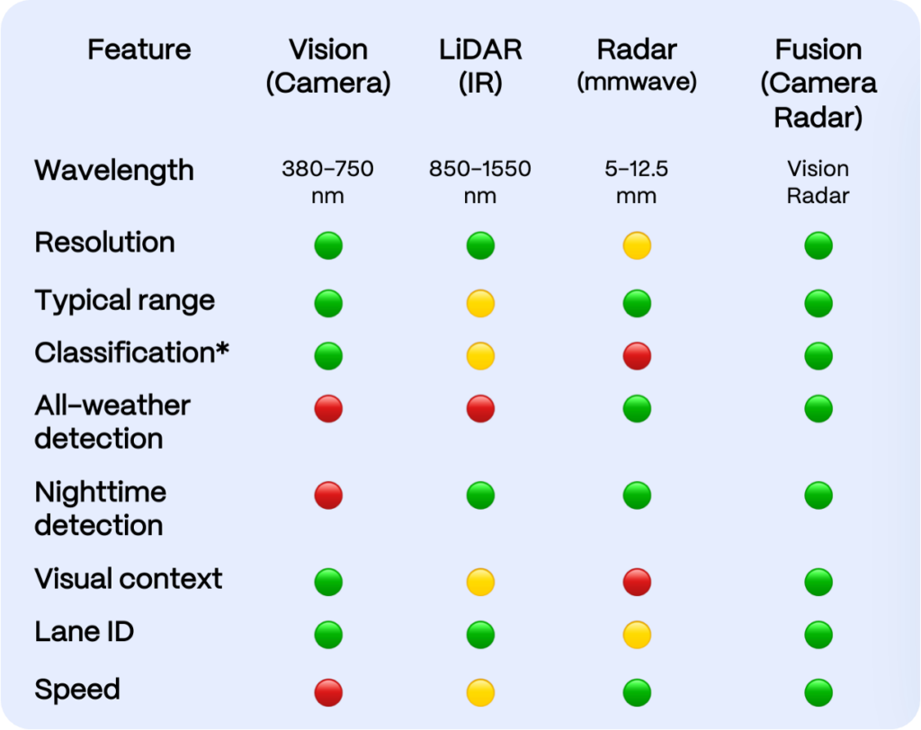 You can see in the chart above why fusion is so powerful. Where vision has challenges (weather and speed), radar excels. The opposite is also true. By combining complementary detection technologies and wavelengths traffic engineers get a more comprehensive detection solution.
